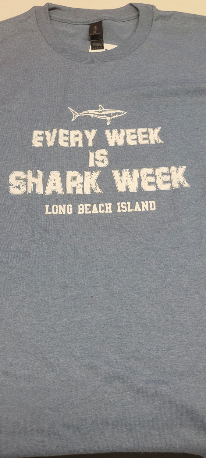 50/50 cotton poly short-sleeved Gildan tee, screen printed with Every Week Is Shark Week and a shark logo.